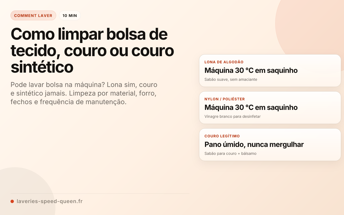 Em resumo: uma bolsa de lona ou nylon pode ser lavada na máquina a 30 °C dentro de um saco de rede. O couro nunca aceita água — limpe-o com pano úmido + sabão de selaria. O couro sintético se limpa com pano de microfibra úmido e uma gota de detergente de louça. O forro se trata com bicarbonato e aspiração. Armazenamento: papel de seda, capa de tecido, nunca empilhado.