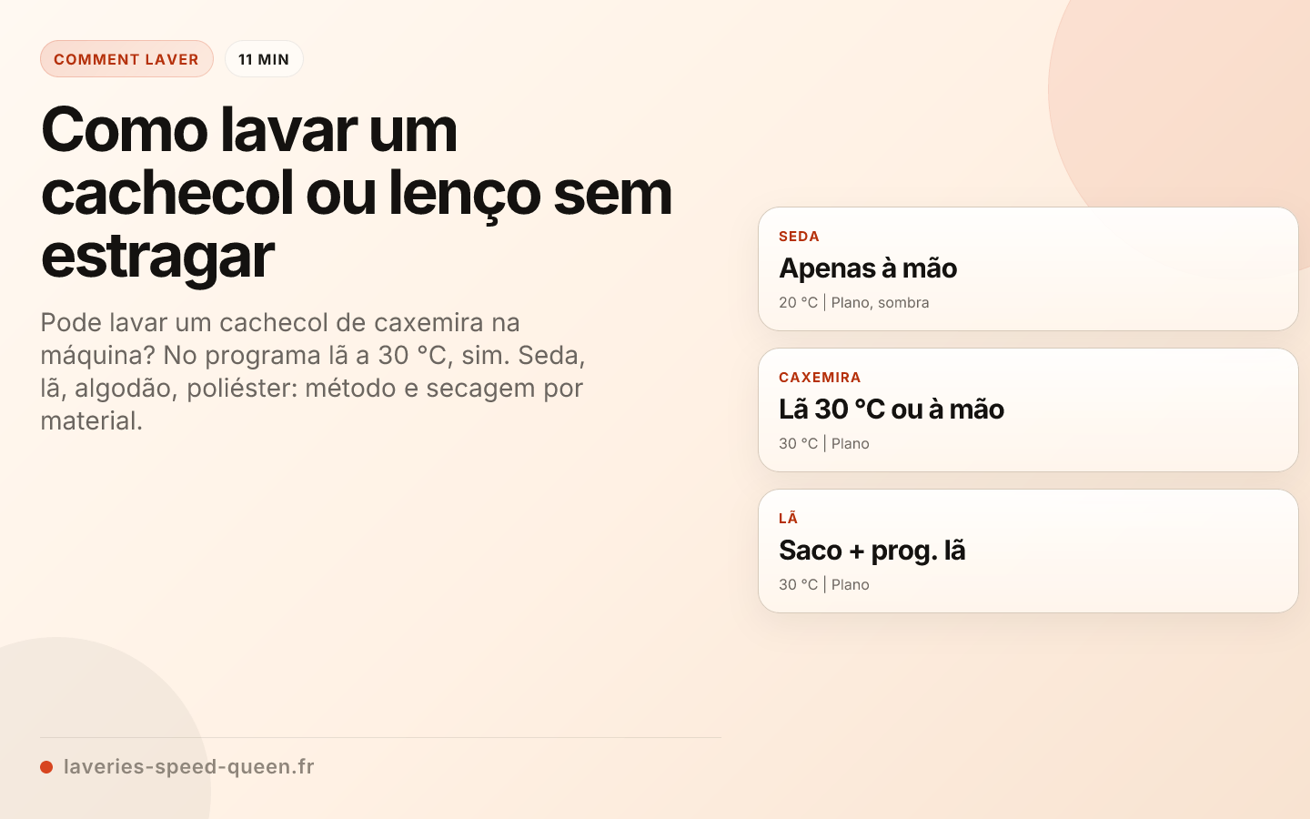 Em resumo: cada material de cachecol ou lenço exige um tratamento específico. Seda: lavagem à mão, água fria 20 °C, sabão de pH neutro. Caxemira: programa lã 30 °C ou à mão. Lã: saco de lavagem + programa lã 30 °C. Algodão e poliéster: máquina 30 °C ciclo delicado. Secagem universal: sempre deitado, nunca na secadora.