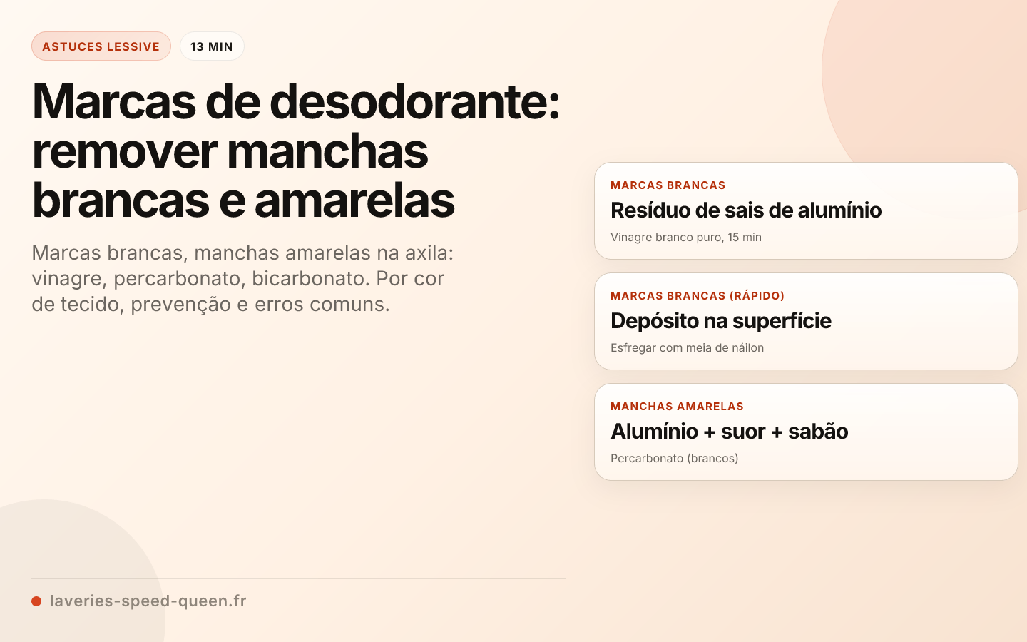 Para um guia completo sobre manchas de transpiração em geral (não apenas ligadas ao desodorante), consulte nosso artigo sobre manchas de transpiração e auréolas amarelas.